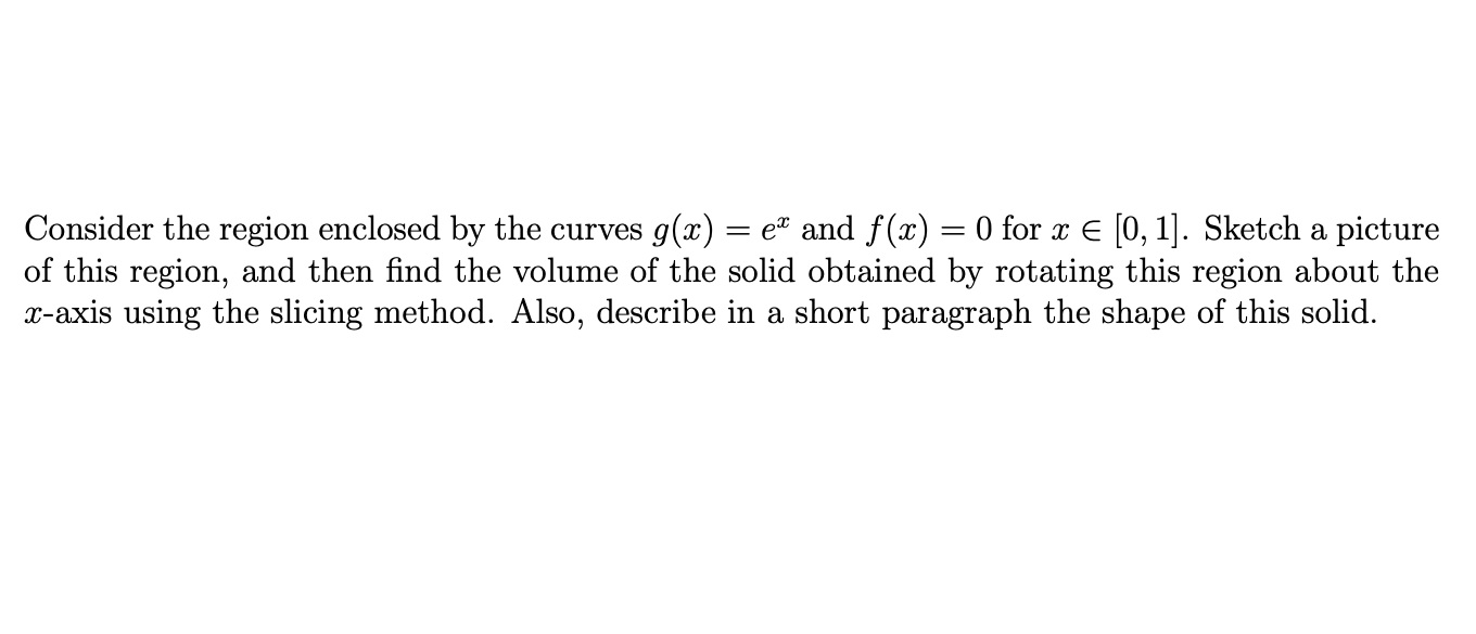 Consider the region enclosed by the curves g(2)=e" and f(t) = 0 for re [0,1]. Sketch a picture of this region, and then find the volume of the solid obtained by rotating this region about the I-axis using the slicing method. Also, describe in a short paragraph the shape of this solid.