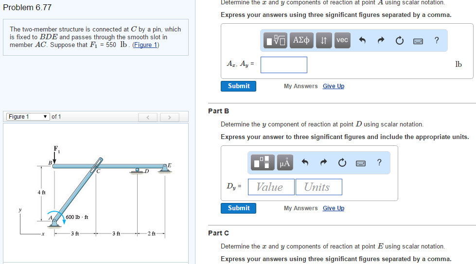The two-member structure is connected at C by a pin, which is fixed to BDE and passes through the smooth slot in member AC. Suppose thatF1 = 550 lb . (Figure 1)